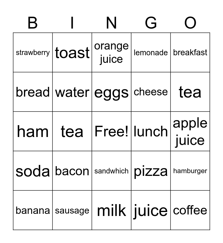This bingo card has a free space and 24 words: bacon, sausage, eggs, banana, breakfast, strawberry, bread, toast, lunch, sandwhich, cheese, ham, pizza, hamburger, water, juice, apple juice, orange juice, tea, tea, coffee, soda, lemonade and milk.