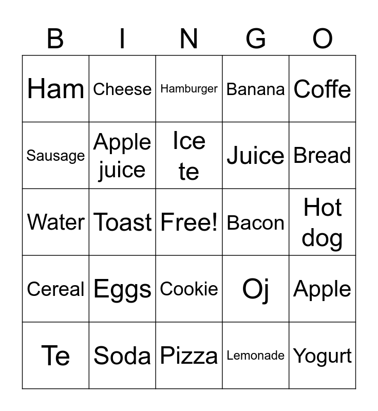 This bingo card has a free space and 24 words: Eggs, Soda, Ice te, Te, Coffe, Ham, Sausage, Cheese, Bacon, Cookie, Juice, Water, Oj, Apple, Apple juice, Lemonade, Hot dog, Hamburger, Bread, Toast, Yogurt, Cereal, Banana and Pizza.