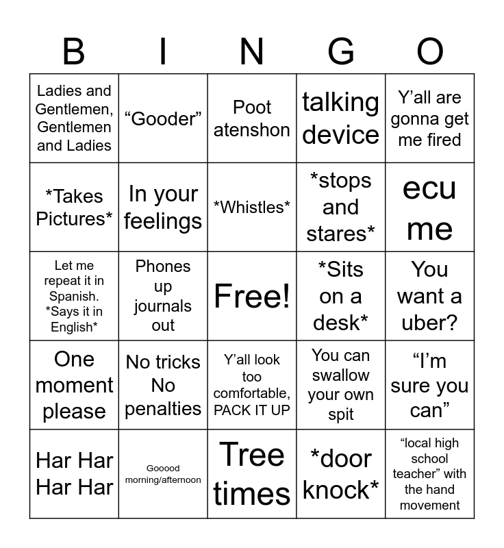 This bingo card has a free space and 24 words: No tricks No penalties, Gooood morning/afternoon, *Whistles*, Har Har Har Har, Y’all are gonna get me fired, Ladies and Gentlemen, Gentlemen and Ladies, *Takes Pictures*, “Gooder”, *Sits on a desk*, Y’all look too comfortable, PACK IT UP, *stops and stares*, Let me repeat it in Spanish. *Says it in English*, You can swallow your own spit, “I’m sure you can”, In your feelings, *door knock*, You want a uber?, Poot atenshon, ecu me, Phones up journals out, “local high school teacher” with the hand movement, One moment please, talking device and Tree times.