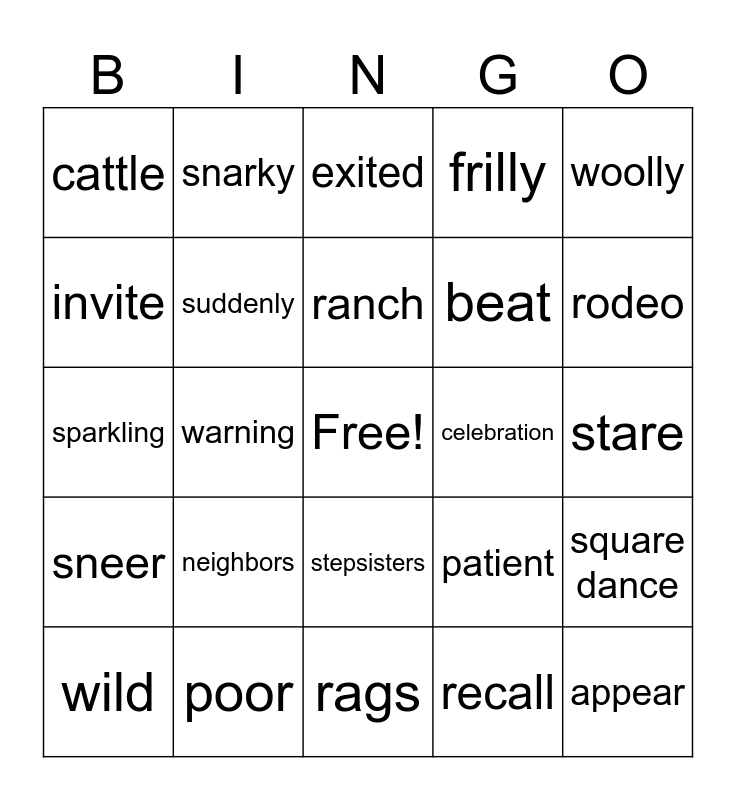 This bingo card has a free space and 24 words: neighbors, poor, ranch, wild, woolly, cattle, invite, snarky, celebration, stepsisters, beat, sparkling, patient, square dance, suddenly, recall, stare, exited, rodeo, warning, appear, sneer, frilly and rags.