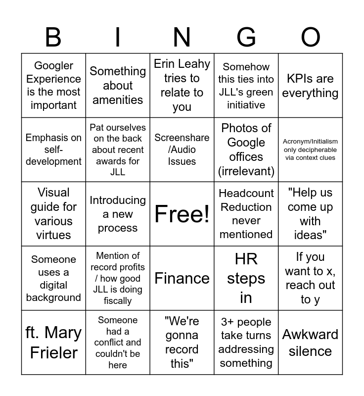 This bingo card has a free space and 39 words: Headcount Reduction is mentioned, "We are proud of our culture at JLL", Inappropriate or Crab Emoji React, HR steps in, If you want to x, reach out to y, Someone uses a digital background, Introducing a new process, Someone is camera-on but not really paying attention, Headcount Reduction never mentioned, "Help us come up with ideas", Emphasis on self-development, Something about amenities, BRGs or Workstreams make a cameo, Acronym/Initialism only decipherable via context clues, Visual guide for various virtues, Mention of record profits / how good JLL is doing fiscally, Finance, Somehow this ties into JLL's green initiative, "Gonna kick/pass/throw it over to...", ft. Mary Frieler, Pat ourselves on the back about recent awards for JLL, Screenshare /Audio Issues, 3+ people take turns addressing something, KPIs are everything, Questions at the end go over time (5+min), Someone had a conflict and couldn't be here, "We're gonna record this", Slide has way too many words, Someone has to explain how recognition works, Googler Experience is the most important, Corrigo is the life blood, "Global", Photos of Google offices (irrelevant), Awkward silence, Someone you've never seen before, That's a great question, but, Erin Leahy tries to relate to you, ft. Will Campbell and Ends way too early (12+min).