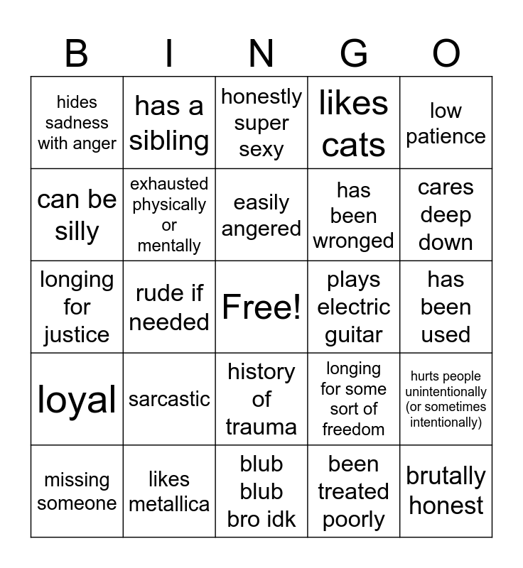 This bingo card has a free space and 24 words: sarcastic, likes metallica, easily angered, missing someone, low patience, hides sadness with anger, can be silly, has a sibling, plays electric guitar, history of trauma, has been wronged, longing for justice, longing for some sort of freedom, hurts people unintentionally (or sometimes intentionally), exhausted physically or mentally, been treated poorly, has been used, honestly super sexy, cares deep down, rude if needed, brutally honest, loyal, likes cats and blub blub bro idk.