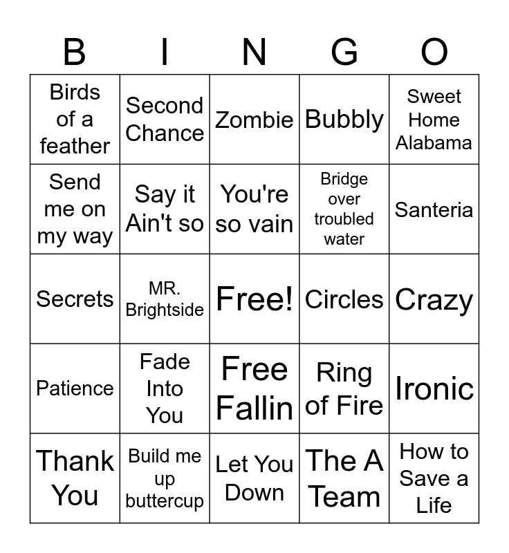 This bingo card has a free space and 31 words: Let You Down, Lonely Day, MR. Brightside, Stuck in the middle, Birds of a feather, Zombie, Say it Ain't so, Ring of Fire, Circles, The A Team, Crazy, How to Save a Life, I Will Survive, Every Rose has it's Thorn, Santeria, Hate Me, Ironic, Fade Into You, Patience, Free Fallin, Sweet Home Alabama, You and Me, Thank You, Second Chance, Bridge over troubled water, Send me on my way, Bubbly, Secrets, Build me up buttercup, You're so vain and Imagine.