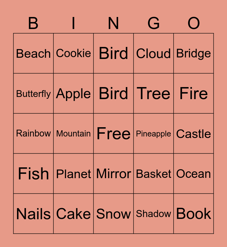 This bingo card has a free space and 24 words: Planet, Cake, Bird, Nails, Bridge, Beach, Butterfly, Cookie, Pineapple, Mirror, Tree, Rainbow, Basket, Ocean, Apple, Shadow, Castle, Bird, Fire, Mountain, Book, Fish, Cloud and Snow.