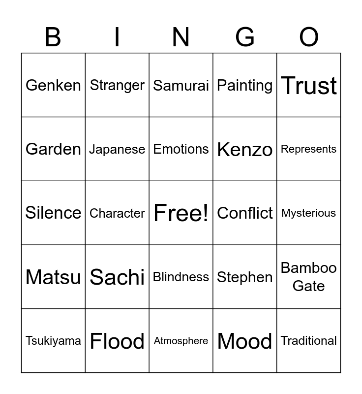 This bingo card has a free space and 24 words: Sachi, Flood, Emotions, Tsukiyama, Trust, Genken, Garden, Stranger, Conflict, Blindness, Kenzo, Silence, Stephen, Bamboo Gate, Japanese, Mood, Mysterious, Samurai, Represents, Character, Traditional, Matsu, Painting and Atmosphere.