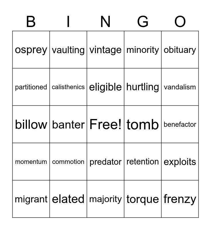 This bingo card has a free space and 24 words: commotion, elated, eligible, migrant, obituary, osprey, partitioned, vaulting, tomb, predator, hurtling, billow, retention, exploits, calisthenics, torque, benefactor, vintage, vandalism, banter, frenzy, momentum, minority and majority.