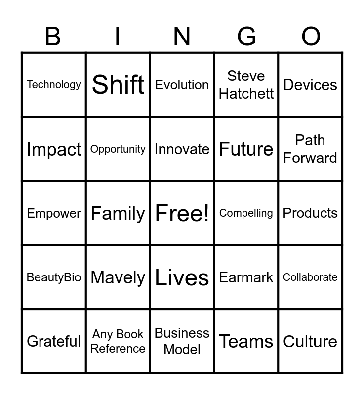 This bingo card has a free space and 66 words: Excited, All In, Passion, Collaborate, Leading, Environment, Shift, Re-think, Innovate, Influence, Lives, Markets, Products, Devices, Improve, Impact, Family, Technology, AI, Future, Mavely, BeautyBio, Steve Hatchett, Strategically, Bold, Dream, Headwind, Economic, Culture, People, Grateful, Potential, Determination, Powerful, Earmark, Any Book Reference, Solution, Empower, Teams, Pursue, Opportunity, Sexy, Compelling, Barrier, Diverse, Trust, Path Forward, Intention, Customer, Insight(s), Partner, Transparent, Incentives, Data, Any Uber Reference, Sweet Spot, Holistic, Macroeconomic, Evolution, Business Model, President's Council, Tough, Who we are, 40 Years, Inefficient and Impacted.