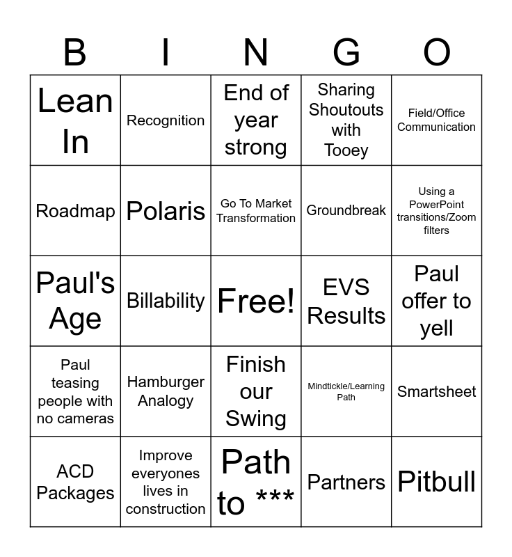 This bingo card has a free space and 24 words: Hamburger Analogy, Improve everyones lives in construction, Go To Market Transformation, ACD Packages, Field/Office Communication, Lean In, Roadmap, Recognition, EVS Results, Finish our Swing, Groundbreak, Paul's Age, Mindtickle/Learning Path, Smartsheet, Polaris, Partners, Paul offer to yell, End of year strong, Using a PowerPoint transitions/Zoom filters, Billability, Pitbull, Paul teasing people with no cameras, Sharing Shoutouts with Tooey and Path to ***.