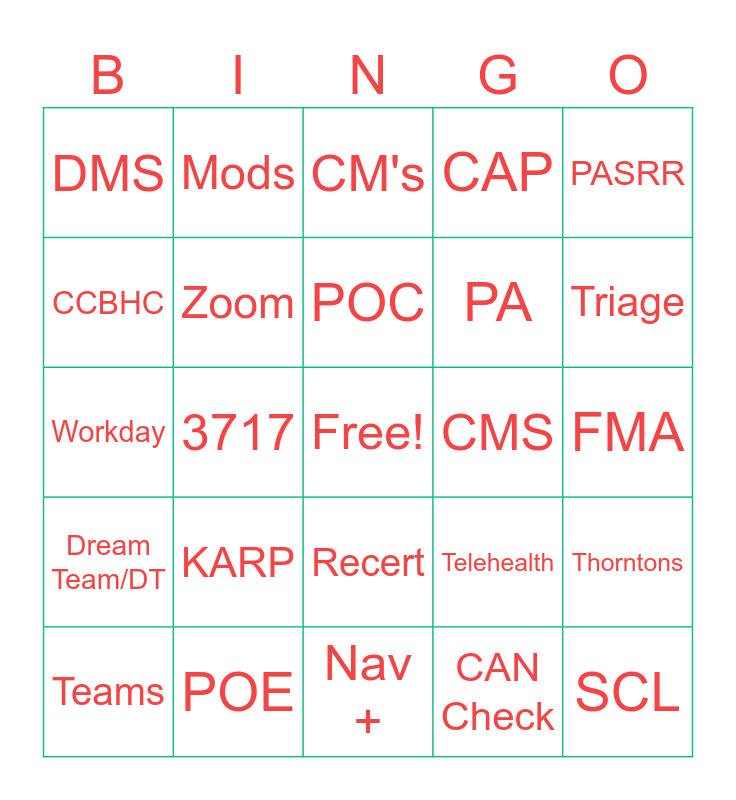 This bingo card has a free space and 61 words: MWMA, POE, HCB, Dream Team/DT, CAN Check, UM's, Zoom, On Call, PA, KLOCS, CAP, OVR, CCBHC, Ali's Alley, Relias, DMS, SCL, PASRR, OT/ST, POC, CMS, CM's, Teams, Thorntons, Requisition, Form 140, KAPP, Skills System, Triage, Appendix K, DME, ABI, H.I.M., Work Matters, Mods, Mains'l, EVV, 3717, LOI, Workday, SE 174, KARP, FMA, CCDS, Telehealth, DDID, 202B, MPW, IPS, Recert, Nav +, Crisis, Pauls, LRI, Avatar NX, PASRR 8, PDS, ERG's, Weekly Bombshell, Rellevate and DAIL.