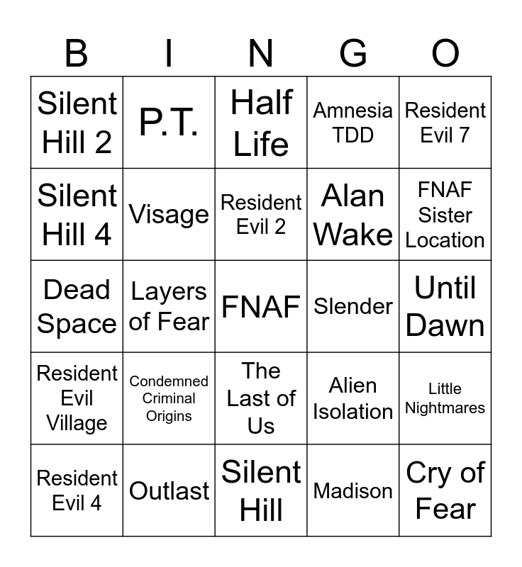 This bingo card has a free space and 24 words: Condemned Criminal Origins, Outlast, Resident Evil 2, Resident Evil 4, Resident Evil 7, Silent Hill 2, Silent Hill 4, P.T., Slender, The Last of Us, Alan Wake, Dead Space, Alien Isolation, Little Nightmares, Visage, Madison, Until Dawn, Half Life, FNAF Sister Location, Layers of Fear, Cry of Fear, Resident Evil Village, Amnesia TDD and Silent Hill.