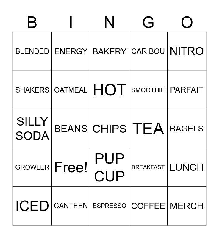 This bingo card has 25 words: Free!, ESPRESSO, HOT, ICED, NITRO, BLENDED, SHAKERS, ENERGY, TEA, PUP CUP, SMOOTHIE, SILLY SODA, BREAKFAST, LUNCH, OATMEAL, MERCH, BAGELS, BAKERY, PARFAIT, BEANS, CHIPS, CANTEEN, GROWLER, CARIBOU and COFFEE.