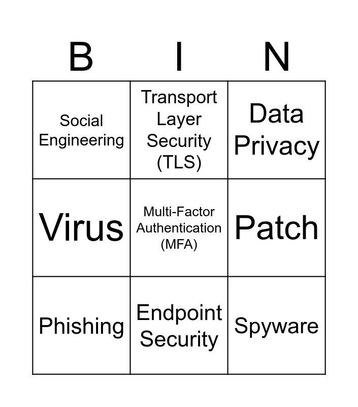 This bingo card has 61 words: Free!, Authentication, Authorization, Encryption, Firewall, Malware, Phishing, Ransomware, Spyware, Trojan, Virus, Vulnerability, Patch, Breach, Insider Threat, Social Engineering, Zero-Day, Multi-Factor Authentication (MFA), Access Control, Endpoint Security, Cyber Attack, Data Privacy, Threat Intelligence, Incident Response, Risk Assessment, Compliance, Security Policy, Penetration Testing, Data Leak, Backup, Recovery Plan, Denial-of-Service (DoS), Intrusion Detection, Secure Socket Layer (SSL), Transport Layer Security (TLS), Digital Signature, Security Awareness, Biometrics, Cloud Security, Identity Theft, Data Encryption Standard (DES), Public Key Infrastructure (PKI), Security Audit, Session Hijacking, Tokenization, Certificate Authority, Secure Coding, Information Security, Security Information and Event Management (SIEM), Access Logs, Network Segmentation, Privileged Access Management (PAM), Security Assertion Markup Language (SAML), Single Sign-On (SSO), GDPR, Framework, SOC 2, IT Governance, Patch Management, Data Loss Prevention (DLP) and Cyber Hygiene.