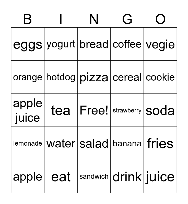 This bingo card has a free space and 24 words: water, eat, pizza, apple, vegie, eggs, orange, yogurt, strawberry, salad, cereal, apple juice, banana, fries, hotdog, drink, soda, bread, cookie, tea, juice, lemonade, coffee and sandwich.