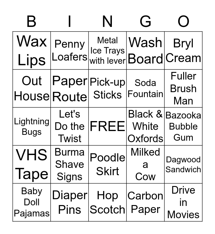 This bingo card has a free space and 25 words: Burma Shave Signs, Hop Scotch, Pick-up Sticks, Baby Doll Pajamas, Bryl Cream, Wax Lips, Out House, Penny Loafers, Black & White Oxfords, Poodle Skirt, Soda Fountain, Lightning Bugs, Milked a Cow, Dagwood Sandwich, Paper Route, Duck Tail, Bazooka Bubble Gum, Metal Ice Trays with lever, Fuller Brush Man, Let's Do the Twist, Drive in Movies, Diaper Pins, VHS Tape, Wash Board and Carbon Paper.