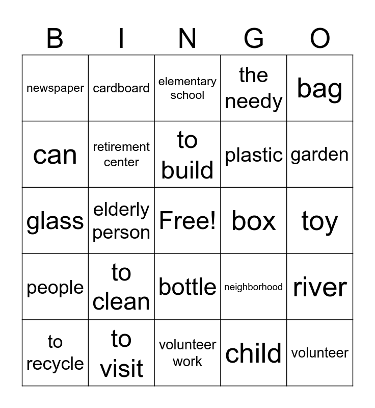 This bingo card has a free space and 24 words: to clean, to visit, to build, to recycle, bag, newspaper, can, cardboard, box, bottle, plastic, glass, neighborhood, river, retirement center, child, toy, elementary school, garden, elderly person, volunteer, people, the needy and volunteer work.