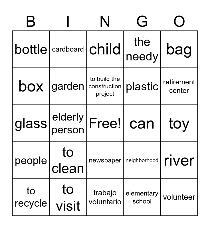 This bingo card has a free space and 24 words: to clean, to visit, to build the construction project, to recycle, bag, bottle, box, cardboard, can, newspaper, plastic, glass, neighborhood, river, garden, elementary school, toy, child, retirement center, elderly person, volunteer, people, the needy and trabajo voluntario.