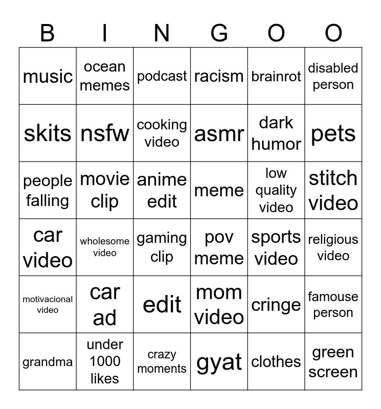 This bingo card has 36 words: mom video, edit, gyat, skits, car video, meme, nsfw, crazy moments, brainrot, cringe, pets, racism, famouse person, movie clip, asmr, music, motivacional video, low quality video, people falling, podcast, anime edit, wholesome video, pov meme, gaming clip, sports video, ocean memes, dark humor, under 1000 likes, cooking video, disabled person, green screen, grandma, religious video, stitch video, car ad and clothes.