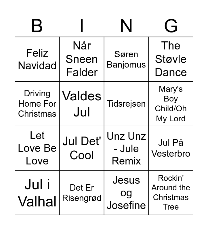 This bingo card has 36 words: Valdes Jul, All I Want for Christmas is You, Vi er på vej til dig, Tidsrejsen, Merry Christmas Everyone, Rockin' Around the Christmas Tree, Mary's Boy Child/Oh My Lord, Last Christmas, Driving Home For Christmas, Pagten (Uden Hinanden), Jul På Vesterbro, The Støvle Dance, Happy Xmas (War Is Over), Det Er Risengrød, Jul Det' Cool, Feliz Navidad, Julefeber, I En Stjerneregn Af Sne, Jul i Valhal, Søren Banjomus, Jesus og Josefine, Gnags' Julesang, Cool Jul, Jul i Angora, Jingle Bell Rock, Når Sneen Falder, Unz Unz - Jule Remix, Kongespil, Let Love Be Love, Valdes Jul, Vil Du Være Min I Nat, Lille Messias, Do They Know It's Christmas, Tinka, I Mørket Finder Lyset Vej and Jul I Krummeland.