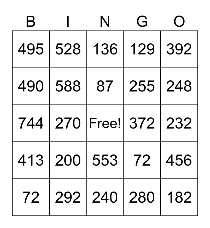 This bingo card has a free space and 30 words: 292, 216, 270, 322, 495, 136, 588, 553, 372, 240, 232, 182, 280, 170, 248, 711, 72, 413, 200, 392, 744, 455, 528, 255, 490, 129, 456, 72, 87 and 252.