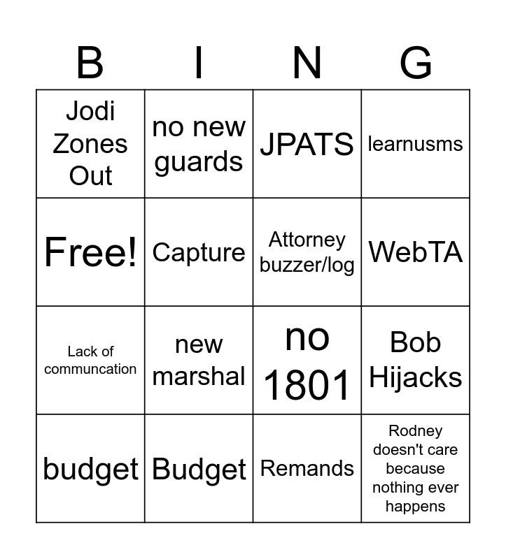 This bingo card has 16 words: Budget, Bob Hijacks, JPATS, Jodi Zones Out, Lack of communcation, no new guards, no 1801, Remands, Free!, Capture, budget, learnusms, new marshal, WebTA, Attorney buzzer/log and Rodney doesn't care because nothing ever happens.