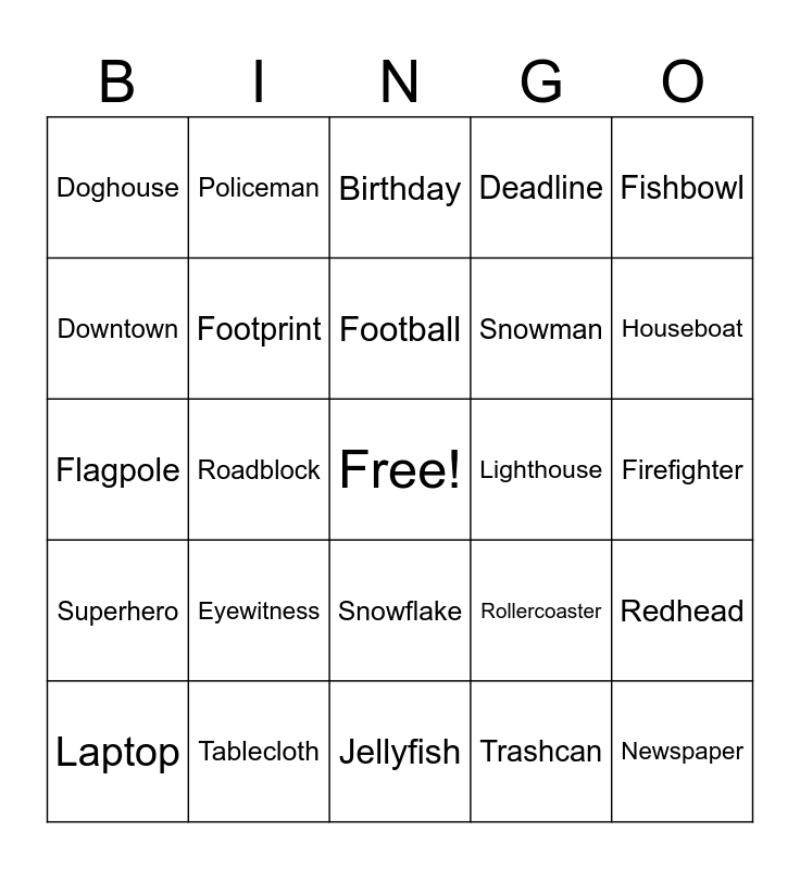 This bingo card has a free space and 80 words: Airport, Backpack, Birthday, Bookstore, Brainstorm, Campfire, Carwash, Coffeemaker, Cookbook, Crosswalk, Cupcake, Database, Deadline, Doghouse, Doorbell, Downtown, Earthquake, Eyewitness, Feedback, Firefighter, Fireworks, Fishbowl, Flagpole, Football, Footprint, Hairbrush, Handshake, Headlight, Highway, Homework, Houseboat, Iceberg, Jellyfish, Keyboard, Laptop, Lighthouse, Mailbox, Milkshake, Moonlight, Newspaper, Notebook, Password, Passport, Peanut, Playground, Policeman, Railroad, Rainbow, Raindrop, Raincoat, Redhead, Roadblock, Rollercoaster, Sailboat, Sandcastle, Scarecrow, Seatbelt, Shoelace, Skateboard, Snowflake, Snowman, Soapbox, Spaceship, Spotlight, Starlight, Stopwatch, Sunburn, Sunglasses, Sunrise, Sunset, Superhero, Tablecloth, Textbook, Toothbrush, Toothpaste, Trafficlight, Trashcan, Turtleneck, Volleyball and Waterfall.