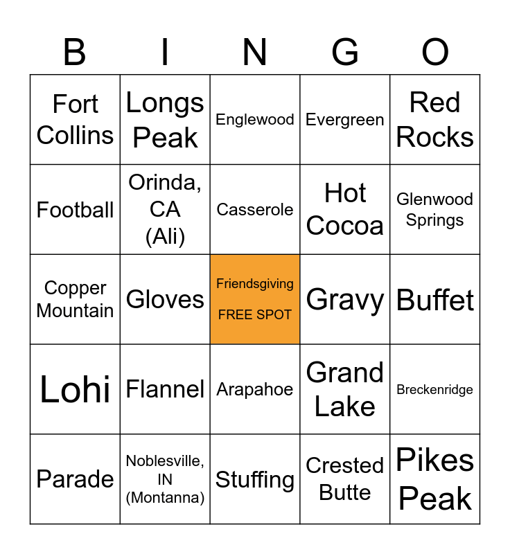 This bingo card has a free space and 88 words: Apple Pie, Appreciation, Arapahoe, Arvada, Aspen, Aurora, Autumn, Bake, Biscuits, Black Friday, Blue Bear, Boulder, Breckenridge, Buffet, Carve, Casserole, Castle Pines, Cedar Park, TX (Ana), Centennial, Cheyenne, Continental Divide, Coors Field, Copper Mountain, Cranberry Sauce, Crested Butte, Denver, Dressing, Durango, Eating, Edgewater, Englewood, Evergreen, Family, Friends, Flannel, Football, Fort Collins, Fried Turkey, Georgetown, Glenwood Springs, Gloves, Gobble, Golden, Grand Lake, Gravy, Ham, Harvest, Highlands Ranch, Holidays, Hot Cocoa, Kindness, Kittridge, Kyle, TX (Rafa), Lakewood, Leftovers, Littleton, Lohi, Longs Peak, Loveland Pass, Mac n Cheese, Mashed Potatoes, Mesa Verde, Morrison, Mount Elbert, Mount Evans, Noblesville, IN (Montanna), November, Orinda, CA (Ali), Parade, Pikes Peak, Potato Salad, Quiet Nap, Recipe, Red Rocks, Rice and beans, RiNo, Royal Gorge, Stress, Stuffing, Sweater, Thanks, Tryptophan, Turkey, Union Station, Westminster, Wheat Ridge, Winter Park and Yams.