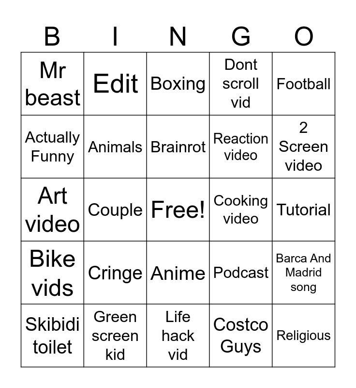 This bingo card has a free space and 24 words: Cringe, Green screen kid, Brainrot, Skibidi toilet, Football, Mr beast, Actually Funny, Edit, Cooking video, Anime, Reaction video, Art video, Podcast, Barca And Madrid song, Animals, Costco Guys, Tutorial, Boxing, 2 Screen video, Couple, Religious, Bike vids, Dont scroll vid and Life hack vid.