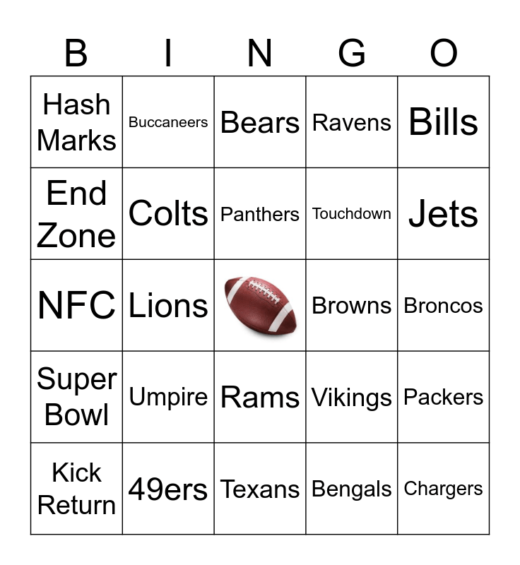 This bingo card has a free space and 55 words: Falcons, Kick Return, AFC, Hash Marks, Texans, Punt, Colts, Defense, Touchdown, Fumble, Ravens, Huddle, Redskins, Safety, Kickoff, Jaguars, Bills, Lions, Sack, Chargers, Browns, Snap, Vikings, Bears, Cardinals, Panthers, Bengals, Cowboys, Broncos, Packers, Chiefs, Interception, Offense, Down, End Zone, NFC, Field Goal, Super Bowl, Titans, Safety, Buccaneers, Halftime, Penalty Flag, Seahawks, Umpire, 49ers, Steelers, Eagles, Raiders, Jets, Giants, Saints, Patriots, Rams and Dolphins.