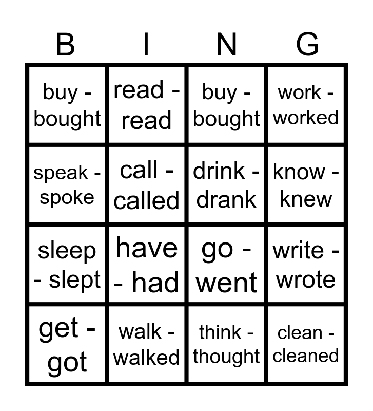 This bingo card has 31 words: Free!, play - played, walk - walked, study - studied, work - worked, buy - bought, call - called, watch - watched, clean - cleaned, move - moved, visit - visited, go - went, see - saw, come - came, have - had, take - took, make - made, get - got, find - found, think - thought, know - knew, leave - left, give - gave, buy - bought, write - wrote, speak - spoke, read - read, drink - drank, eat - ate, sleep - slept and meet - met.