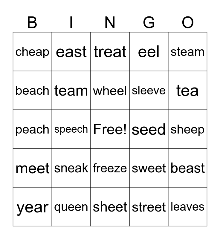 This bingo card has a free space and 24 words: sneak, queen, wheel, year, steam, cheap, beach, east, seed, freeze, sleeve, peach, sweet, beast, team, street, sheep, treat, tea, speech, leaves, meet, eel and sheet.