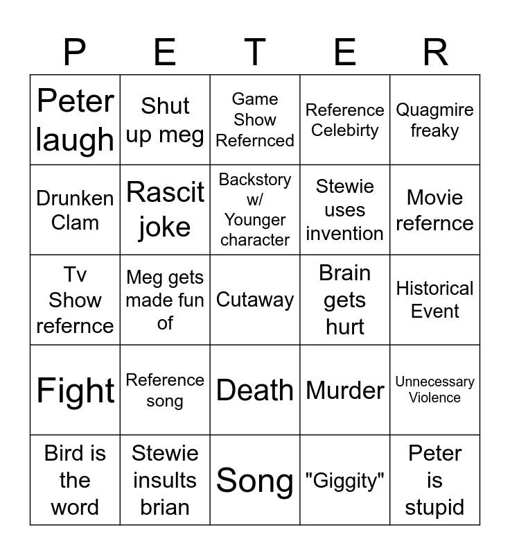 This bingo card has a free space and 24 words: Reference song, Stewie insults brian, Backstory w/ Younger character, Bird is the word, Quagmire freaky, Peter laugh, Drunken Clam, Shut up meg, Brain gets hurt, Death, Stewie uses invention, Tv Show refernce, Murder, Unnecessary Violence, Rascit joke, "Giggity", Historical Event, Game Show Refernced, Movie refernce, Meg gets made fun of, Peter is stupid, Fight, Reference Celebirty and Song.