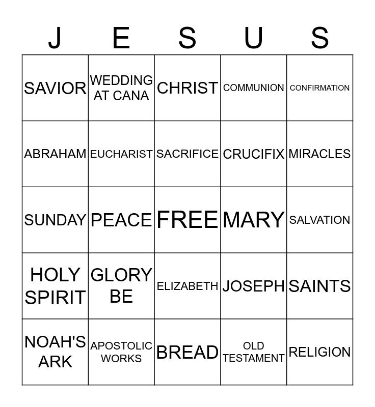 This bingo card has a free space and 24 words: GLORY BE, APOSTOLIC WORKS, SACRIFICE, NOAH'S ARK, CONFIRMATION, SAVIOR, ABRAHAM, WEDDING AT CANA, MARY, ELIZABETH, CRUCIFIX, SUNDAY, JOSEPH, SAINTS, EUCHARIST, OLD TESTAMENT, SALVATION, CHRIST, MIRACLES, PEACE, RELIGION, HOLY SPIRIT, COMMUNION and BREAD.