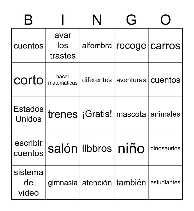 This bingo card has a free space and 42 words: iguales, diferentes, mismo, salón, también, dinosaurios, estudiantes, señora, alfombra, libbros, animales, cuentos, trenes, carros, niña, niño, México, Estados Unidos, cocinar, avar los trastes, corto, largo, escuchar, cuentos, audífonos, lectura, aventuras, baloncesto, fútbol, menor, mayor, escribir cuentos, hacer matemáticas, atención, caricaturas, sistema de video, gimnasia, mascota, columpio, responsables, recoge and trenzas.