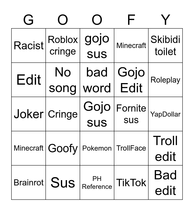 This bingo card has a free space and 24 words: Goofy, Sus, bad word, Brainrot, Skibidi toilet, Racist, Edit, Roblox cringe, Fornite sus, Pokemon, Gojo Edit, Joker, TrollFace, Troll edit, No song, TikTok, YapDollar, gojo sus, Roleplay, Cringe, Bad edit, Minecraft, Minecraft and PH Reference.