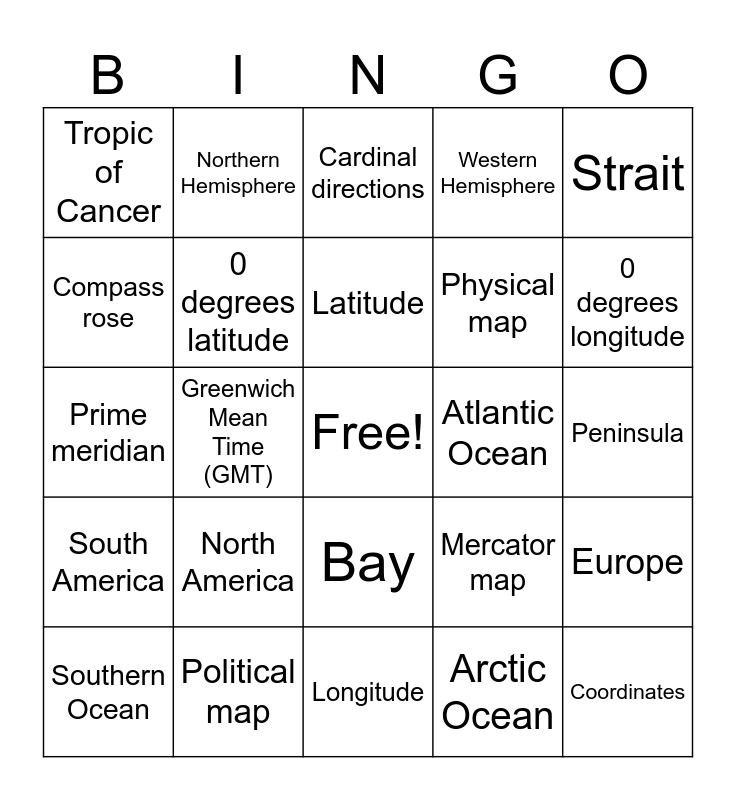 This bingo card has a free space and 27 words: Mercator map, Globe, Physical map, Longitude, Compass rose, Cardinal directions, Northern Hemisphere, South America, Atlantic Ocean, Europe, Prime meridian, Western Hemisphere, Southern Ocean, Political map, 0 degrees longitude, Pacific Ocean, 0 degrees latitude, Latitude, North America, Tropic of Cancer, Peninsula, Arctic Ocean, Greenwich Mean Time (GMT), Coordinates, Bay, Strait and Continent.