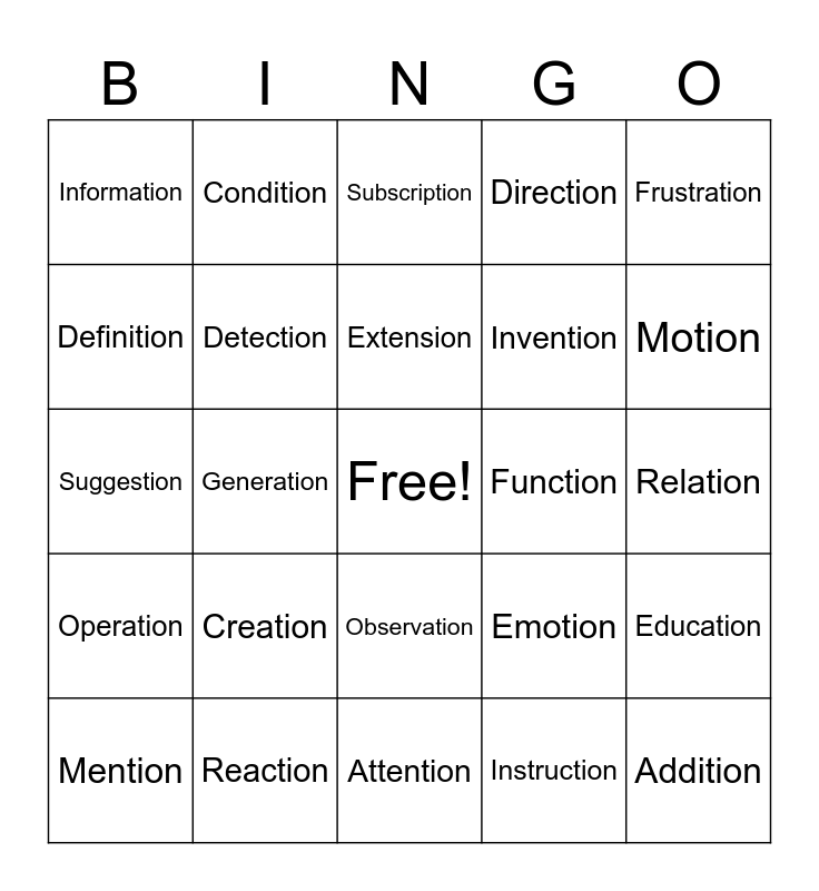 This bingo card has a free space and 47 words: Action, Addition, Ambition, Attention, Creation, Collection, Condition, Construction, Definition, Description, Detection, Direction, Education, Emotion, Election, Explosion, Extension, Function, Fiction, Frustration, Generation, Instruction, Information, Invention, Location, Motion, Mention, Nation, Observation, Operation, Option, Pollution, Position, Production, Question, Reaction, Relation, Revolution, Selection, Situation, Solution, Subscription, Suggestion, Tradition, Translation, Transition and Vision.