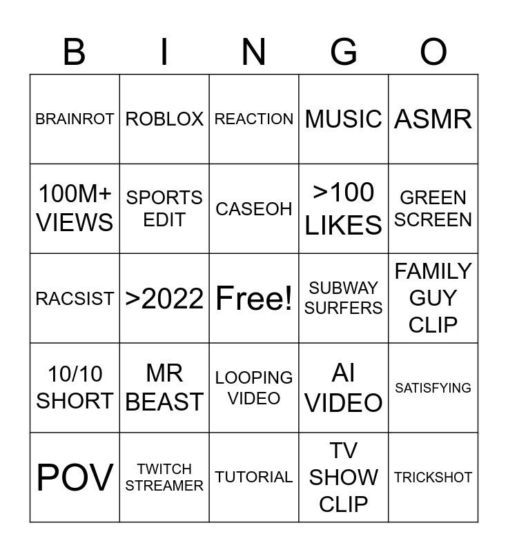 This bingo card has a free space and 24 words: MR BEAST, TWITCH STREAMER, CASEOH, POV, ASMR, BRAINROT, 100M+ VIEWS, ROBLOX, SUBWAY SURFERS, LOOPING VIDEO, >100 LIKES, RACSIST, AI VIDEO, SATISFYING, SPORTS EDIT, TV SHOW CLIP, FAMILY GUY CLIP, REACTION, GREEN SCREEN, >2022, TRICKSHOT, 10/10 SHORT, MUSIC and TUTORIAL.