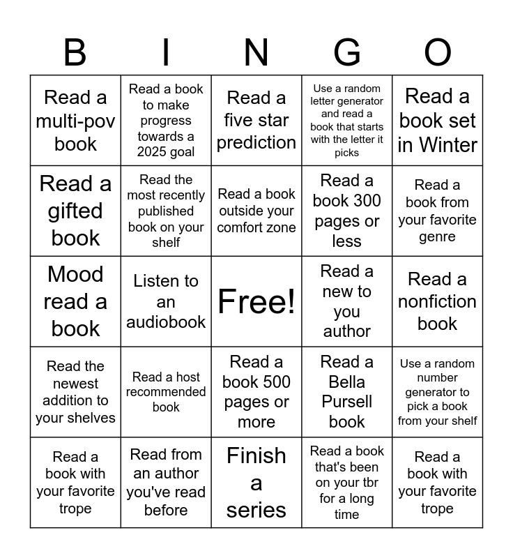 This bingo card has a free space and 24 words: Read a host recommended book, Read from an author you've read before, Read a book outside your comfort zone, Read a book with your favorite trope, Read a book set in Winter, Read a multi-pov book, Read a gifted book, Read a book to make progress towards a 2025 goal, Read a new to you author, Read a book 500 pages or more, Read a book 300 pages or less, Mood read a book, Read a Bella Pursell book, Use a random number generator to pick a book from your shelf, Read the most recently published book on your shelf, Read a book that's been on your tbr for a long time, Read a nonfiction book, Read a five star prediction, Read a book from your favorite genre, Listen to an audiobook, Read a book with your favorite trope, Read the newest addition to your shelves, Use a random letter generator and read a book that starts with the letter it picks and Finish a series.