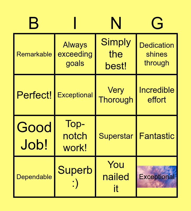 This bingo card has 1 images and 16 words: Superb :), Fantastic, Simply the best!, Remarkable, Good Job!, Always exceeding goals, Superstar, You nailed it, Perfect!, Exceptional, Dependable, Dedication shines through, Top-notch work!, Incredible effort, Very Thorough and Exceptional.