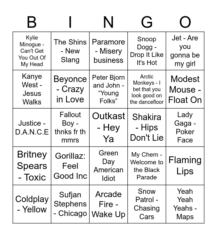 This bingo card has 25 words: Gorillaz: Feel Good Inc, Arcade Fire - Wake Up, Peter Bjorn and John - “Young Folks”, Coldplay - Yellow, Jet - Are you gonna be my girl, Kylie Minogue - Can't Get You Out Of My Head, Kanye West - Jesus Walks, The Shins - New Slang, Shakira - Hips Don't Lie, Green Day American Idiot, Arctic Monkeys - I bet that you look good on the dancefloor, Justice - D.A.N.C.E, My Chem - Welcome to the Black Parade, Flaming Lips, Beyonce - Crazy in Love, Yeah Yeah Yeahs - Maps, Lady Gaga - Poker Face, Paramore - Misery business, Modest Mouse - Float On, Fallout Boy - thnks fr th mmrs, Outkast - Hey Ya, Sufjan Stephens - Chicago, Britney Spears - Toxic, Snoop Dogg - Drop It Like It's Hot and Snow Patrol - Chasing Cars.