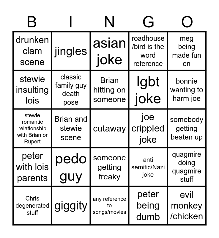 This bingo card has a free space and 24 words: pedo guy, giggity, Brian hitting on someone, Chris degenerated stuff, meg being made fun on, drunken clam scene, stewie insulting lois, jingles, joe crippled joke, someone getting freaky, lgbt joke, stewie romantic relationship with Brian or Rupert, anti semitic/Nazi joke, quagmire doing quagmire stuff, classic family guy death pose, peter being dumb, somebody getting beaten up, asian joke, bonnie wanting to harm joe, Brian and stewie scene, evil monkey /chicken, peter with lois parents, roadhouse /bird is the word reference and any reference to songs/movies.