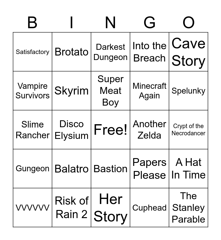 This bingo card has a free space and 24 words: Balatro, Risk of Rain 2, Super Meat Boy, VVVVVV, Cave Story, Satisfactory, Vampire Survivors, Brotato, Another Zelda, Bastion, Minecraft Again, Slime Rancher, Papers Please, A Hat In Time, Skyrim, Cuphead, Crypt of the Necrodancer, Darkest Dungeon, Spelunky, Disco Elysium, The Stanley Parable, Gungeon, Into the Breach and Her Story.
