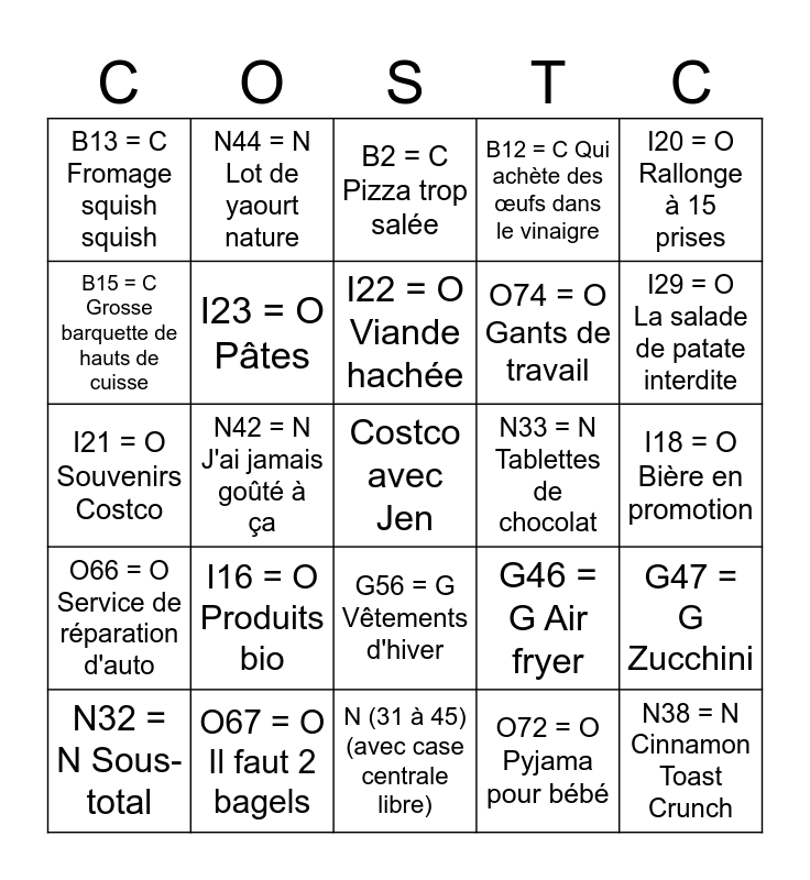 This bingo card has a free space and 81 words: B (1 à 15), B1 = C Hot-dog à 1.50$, B2 = C Pizza trop salée, B3 = C Carte de membre, B4 = C Tacos tempura, B5 = C Détergent à lessive, B6 = C Caisse en libre-service, B7 = C Lait au chocolat, B8 = C Melon d'eau à 16$, B9 = C Pourquoi tu m'achètes pas des fleurs, on passe devant, B10 = C Grands sacs de farine, B11 = C Sauces BBQ, B12 = C Qui achète des œufs dans le vinaigre, B13 = C Fromage squish squish, B14 = C Échantillons gratuits, B15 = C Grosse barquette de hauts de cuisse, I (16 à 30), I16 = O Produits bio, I17 = O Granola sans gluten, I18 = O Bière en promotion, I19 = O Clever Box, I20 = O Rallonge à 15 prises, I21 = O Souvenirs Costco, I22 = O Viande hachée, I23 = O Pâtes, I24 = O Boulangerie Costco, I25 = O Aliments pour chats, I26 = O Meubles de jardin, I27 = O Produits d'entretien ménager, I28 = O Tapis de course, I29 = O La salade de patate interdite, I30 = O Rôtisserie de poulet, N (31 à 45) (avec case centrale libre), N31 = N Chandail Kirkland, N32 = N Sous-total, N33 = N Tablettes de chocolat, N34 = N Section des livres, N35 = N Merde, j'ai pas ma carte, N36 = N Ouuuh des Ferrero Rocher, N37 = N André, est-ce que tu peux m'acheter ça ?, N38 = N Cinnamon Toast Crunch, N39 = N Pop-corn, N40 = N Il fait trop froid dans le frigo, N41 = N Gros toutou, N42 = N J'ai jamais goûté à ça, N43 = N Boîtes de biscuits, N44 = N Lot de yaourt nature, N45 = N Bulgogi, N46 = N (case centrale libre), G (46 à 60), G46 = G Air fryer, G47 = G Zucchini, G48 = G Cartes-cadeaux Costco, G49 = G Offre spéciale sur les téléviseurs, G50 = G Gain, G51 = G Ma tante travaille au Costco, G52 = G Vêtements de sport, G53 = G Devine ça, l'a coûté combien ?, G54 = G Saladier à Aurélie, G55 = G Batterie de cuisine, G56 = G Vêtements d'hiver, G57 = G Kit de premiers secours, G58 = G Appareils électroménagers, G59 = G Je suis venue pour 1 chose, G60 = G Piles de papier toilette, O (61 à 75), O61 = O Costco Saint-Bruno, O62 = O J'aime Costco, O63 = O Leggings, O64 = O Costco Boucherville, O65 = O Couches pour bébé, O66 = O Service de réparation d'auto, O67 = O Il faut 2 bagels, O68 = O Centre du pneu, O69 = O Tu vas encore au Costco ?, O70 = O Tout se retourne au Costco, O71 = O Costco Brossard, O72 = O Pyjama pour bébé, O73 = O Lait sans lactose, O74 = O Gants de travail and O75 = O Non André, on va pas à la section des snacks.