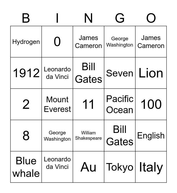 This bingo card has a free space and 24 words: George Washington, Leonardo da Vinci, Bill Gates, Blue whale, James Cameron, Hydrogen, 1912, 0, Pacific Ocean, William Shakespeare, Seven, 2, Bill Gates, English, Leonardo da Vinci, Tokyo, 100, James Cameron, Lion, Mount Everest, Italy, 8, George Washington and Au.