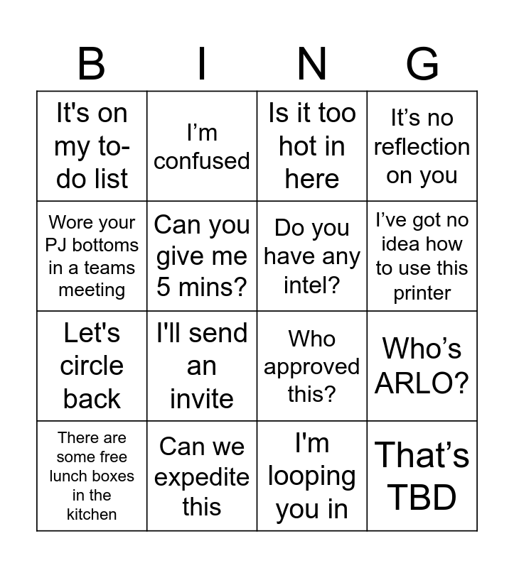 This bingo card has 76 words: Free!, I’m in the dudgeon, Is it too hot in here, Let’s take it offline, Sat in webex mtg wondering where everyone was, Bamboozled by acronym, Employer of choice, We hear you, We take your feedback seriously, Nailed it, Nice one, You’ve got this, I’ve got no idea how to use this printer, Can you give me 5 mins?, I don’t know what SMFSL stands for?, Who’s ARLO?, Haven’t had lunch today, There are some free lunch boxes in the kitchen, Are you at 603 or 41?, Wore your PJ bottoms in a teams meeting, You left your headphones at home, Who approved this?, Do you have any intel?, I’m confused, It’s no reflection on you, Team shout-out, AMAZING!!!, Love ya work, Sorry I’ve got to take this call, My bus/train is running late, Traffic was mad, Let's get some bandwidth for that, Just for my benefit, Ping me when you’re free, I'll send an invite, Let's circle back, We need to align on this, Let me know if that works for you, I'm looping you in, Just to clarify..., Does that make sense?, Let's get this on the radar, I'll follow up on that, As per my last email, Do you have a minute?, You’re on mute, I'm slammed today, It's on my to-do list, I'll get back to you on that, Let me check my calendar, Is this a priority, Let’s manage their expectations, That's a great question, I’ll ping you after the meeting, What’s the action item here, I need this ASAP, Let’s take it to the next level, Let’s drill down on that, It's a quick-win, Low hanging fruit, Who’s taking point on this, Who’s chairing the meeting, This is a high-level overview, Can you clarify that?, Let’s connect next week, What’s the status on that, Can we expedite this, This is a game-changer, We’re in the weeds here, What’s the timeline, Let’s put a pin in that, That’s TBD, Can we add that to the agenda, What’s the ROI on this, I’ve got school drop off/pick up and Used an emoji in an email.