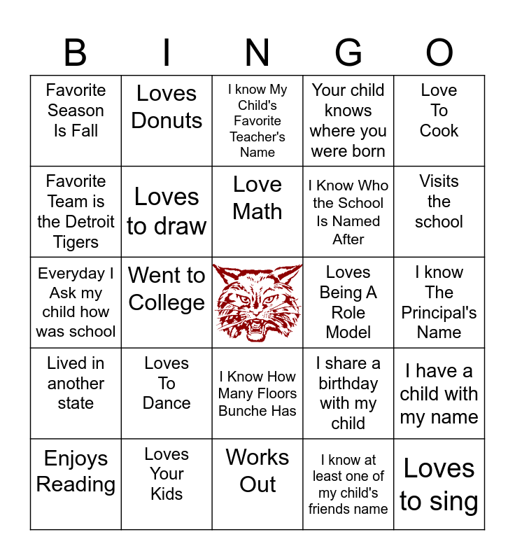 This bingo card has a free space and 24 words: Loves To Dance, Loves Your Kids, Love Math, Enjoys Reading, Love To Cook, Favorite Season Is Fall, Favorite Team is the Detroit Tigers, Loves Donuts, Loves Being A Role Model, I Know How Many Floors Bunche Has, I Know Who the School Is Named After, Everyday I Ask my child how was school, I share a birthday with my child, I have a child with my name, Loves to draw, I know at least one of my child's friends name, I know The Principal's Name, I know My Child's Favorite Teacher's Name, Visits the school, Went to College, Loves to sing, Lived in another state, Your child knows where you were born and Works Out.