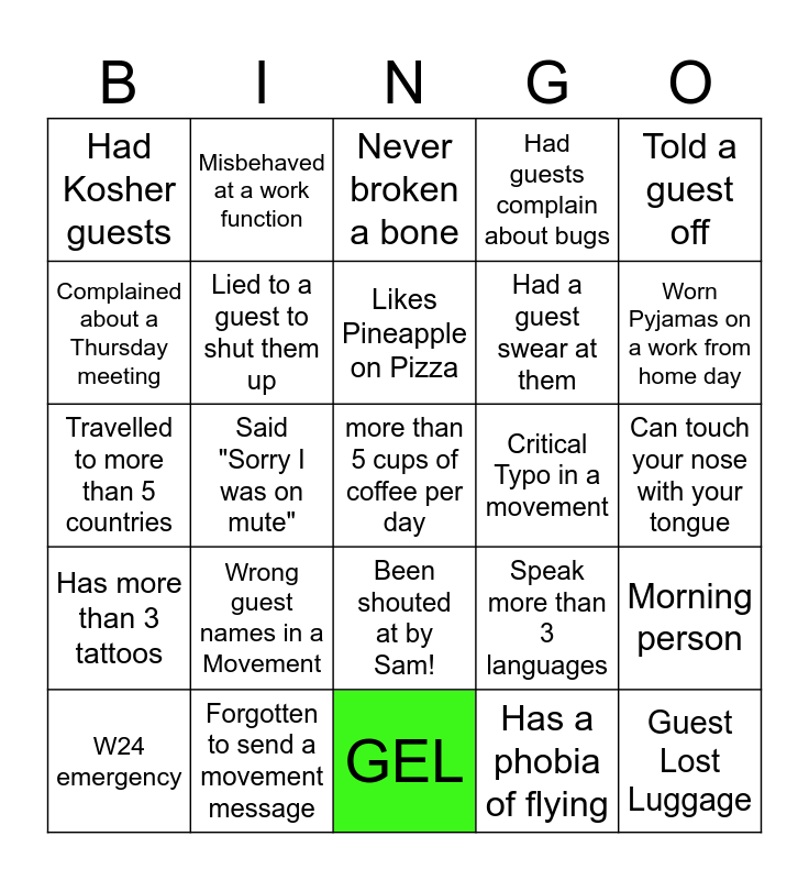 This bingo card has 25 words: Has more than 3 tattoos, Forgotten to send a movement message, more than 5 cups of coffee per day, Has a phobia of flying, Told a guest off, Had Kosher guests, Misbehaved at a work function, Never broken a bone, Critical Typo in a movement, Morning person, Complained about a Thursday meeting, Lied to a guest to shut them up, GEL, Speak more than 3 languages, Worn Pyjamas on a work from home day, W24 emergency, Said "Sorry I was on mute", Likes Pineapple on Pizza, Had a guest swear at them, Can touch your nose with your tongue, Travelled to more than 5 countries, Wrong guest names in a Movement, Been shouted at by Sam!, Had guests complain about bugs and Guest Lost Luggage.