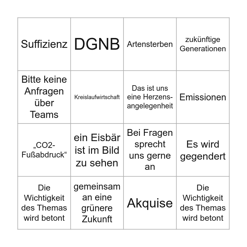 This bingo card has 27 words: Wir sehen uns da in der Verantwortung, Flächenversiegelung, „CO2-Fußabdruck“, dramatische Bilder werden gezeigt, Kreislaufwirtschaft, Artensterben, DGNB, Die Wichtigkeit des Themas wird betont, gemeinsam an eine grünere Zukunft, Tipping- Points, Bei Fragen sprecht uns gerne an, zukünftige Generationen, CO2, Irreversibel, ein Eisbär ist im Bild zu sehen, BNB, Das ist uns eine Herzens-angelegenheit, Emissionen, Recycling, Suffizienz, Akquise, HI 5, Es wird gegendert, Die Wichtigkeit des Themas wird betont, HI+N als Pilotprojektsteuerer, Bitte keine Anfragen über Teams and Bei Fragen sprecht uns gerne an.