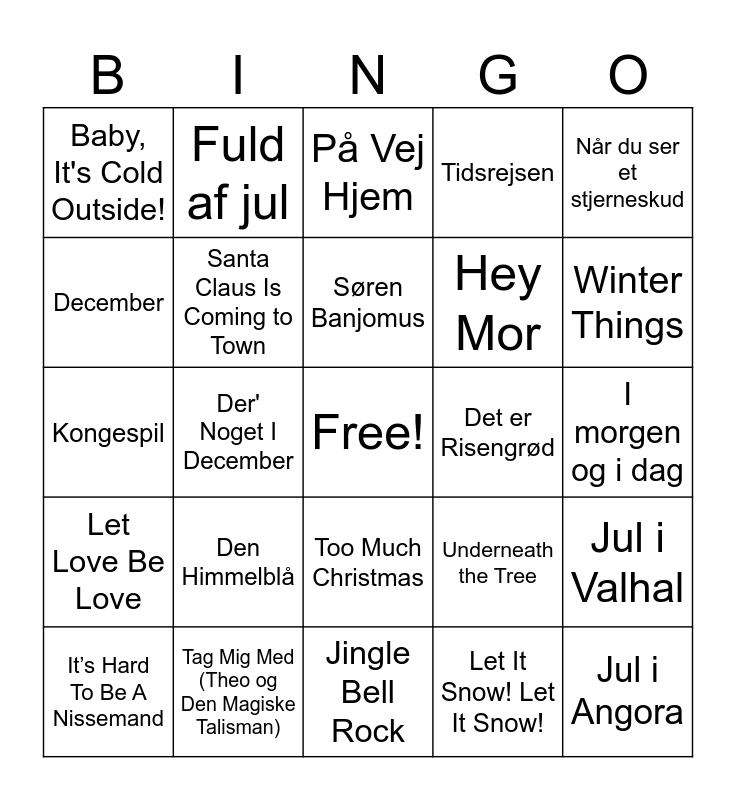 This bingo card has a free space and 50 words: Last Chrismas, Jul i Angora, Mistletoe, Jingle Bell Rock, Den Himmelblå, Jul Det' Cool, Fuld af jul, Jesus & Josefine, December, Jul på Vesterbro, Santa Claus Is Coming to Town, Tidsrejsen, Jul i Valhal, Underneath the Tree, Driving Home For Christmas, Santa Baby, Søren Banjomus, Det er Risengrød, På Loftet Sidder Nissen Med Sin Julegrød, Når du ser et stjerneskud, Der' Noget I December, Let It Snow! Let It Snow!, Baby, It's Cold Outside!, Hey Mor, Guld Jul, I Saw Mommy Kissing Santa Claus, Winter Things, X-Mas (Let’s Do It Again), På Vej Hjem, Too Much Christmas, Silent Night, Rudolph The Red-Nosed Reindeer, Show Me The Magic, Pagten (Uden Hinanden), Tag Mig Med (Theo og Den Magiske Talisman), Se En Stjerne, Den Anden Verden, Ludvig Og Julemanden, Glade Jul, I morgen og i dag, Igen I År, Cool Jul, Til Julebal i Nisseland, Vi Er På Vej Til Dig, It’s Hard To Be A Nissemand, Kongespil, Lokes rapsody, What Christmas Means To Me, Let Love Be Love and Jingle Bales Intro.