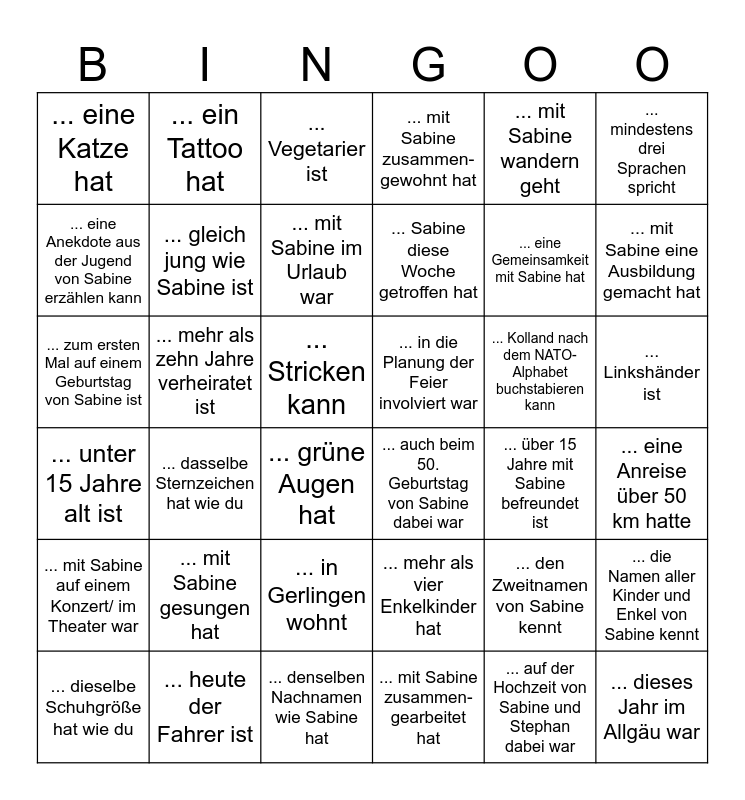 This bingo card has 36 words: ... mehr als vier Enkelkinder hat, ... in Gerlingen wohnt, ... mit Sabine zusammen-gearbeitet hat, ... eine Anekdote aus der Jugend von Sabine erzählen kann, ... unter 15 Jahre alt ist, ... in die Planung der Feier involviert war, ... gleich jung wie Sabine ist, ... denselben Nachnamen wie Sabine hat, ... mit Sabine wandern geht, ... den Zweitnamen von Sabine kennt, ... mit Sabine eine Ausbildung gemacht hat, ... mit Sabine zusammen-gewohnt hat, ... die Namen aller Kinder und Enkel von Sabine kennt, ... mehr als zehn Jahre verheiratet ist, ... Sabine diese Woche getroffen hat, ... eine Katze hat, ... mit Sabine auf einem Konzert/ im Theater war, ... Kolland nach dem NATO-Alphabet buchstabieren kann, ... zum ersten Mal auf einem Geburtstag von Sabine ist, ... Vegetarier ist, ... Stricken kann, ... dasselbe Sternzeichen hat wie du, ... auch beim 50. Geburtstag von Sabine dabei war, ... grüne Augen hat, ... über 15 Jahre mit Sabine befreundet ist, ... ein Tattoo hat, ... eine Gemeinsamkeit mit Sabine hat, ... heute der Fahrer ist, ... mit Sabine im Urlaub war, ... mindestens drei Sprachen spricht, ... dieses Jahr im Allgäu war, ... dieselbe Schuhgröße hat wie du, ... eine Anreise über 50 km hatte, ... Linkshänder ist, ... mit Sabine gesungen hat and ... auf der Hochzeit von Sabine und Stephan dabei war.